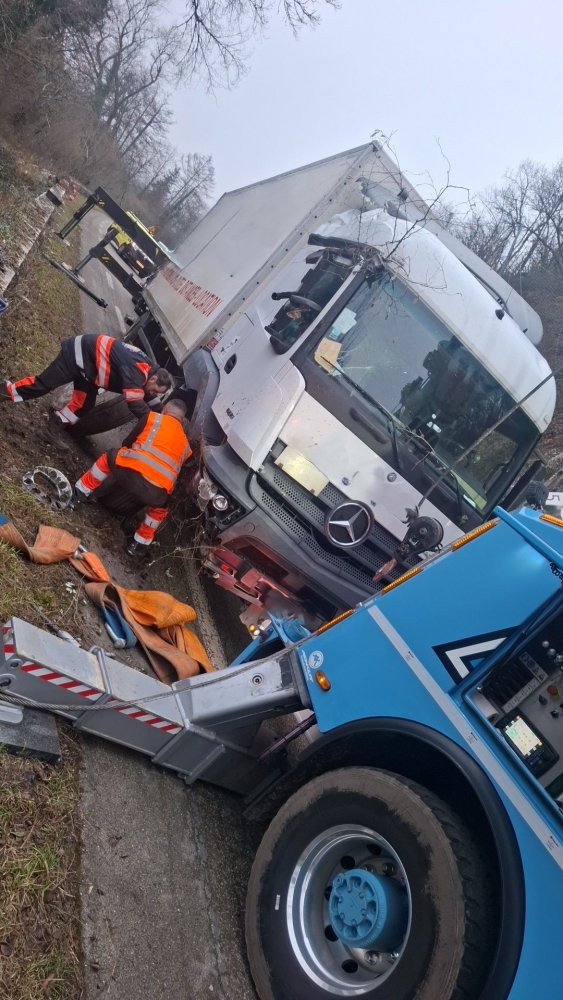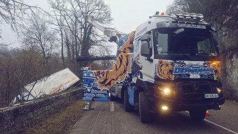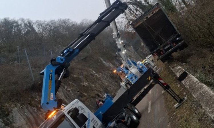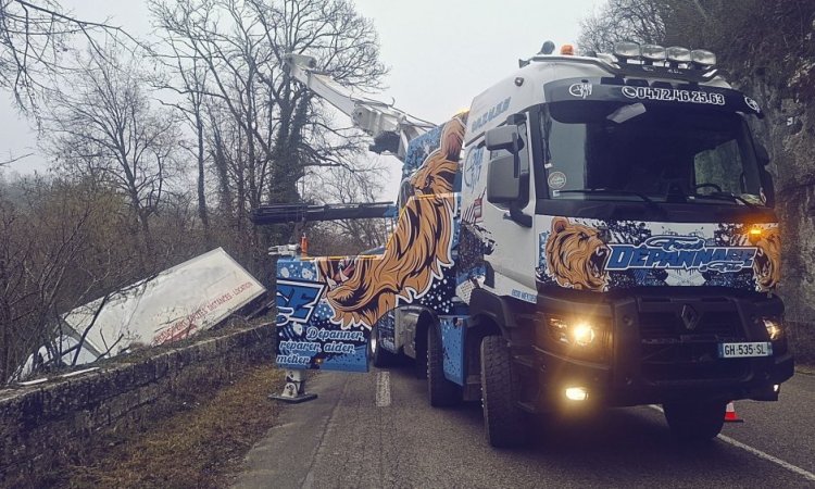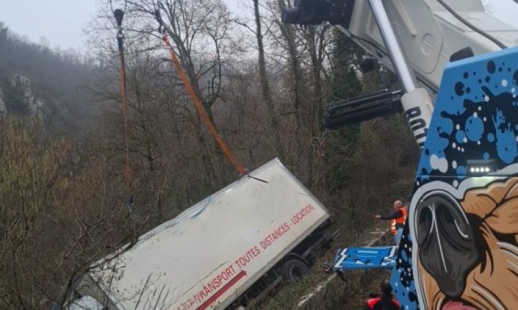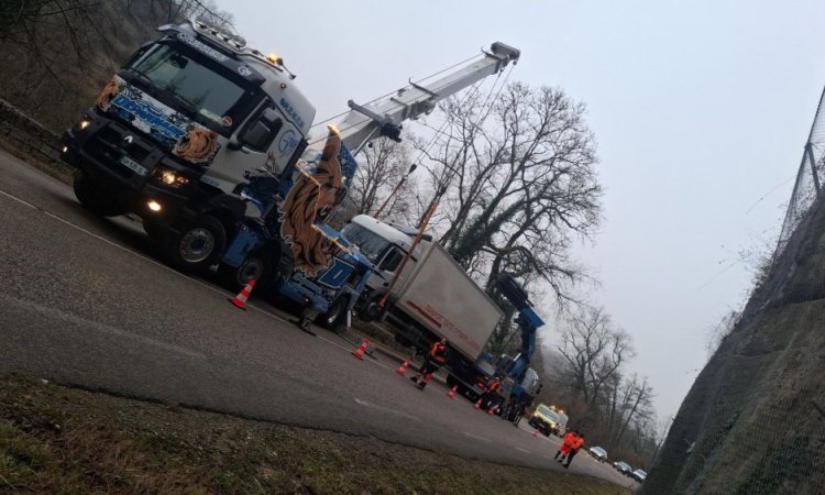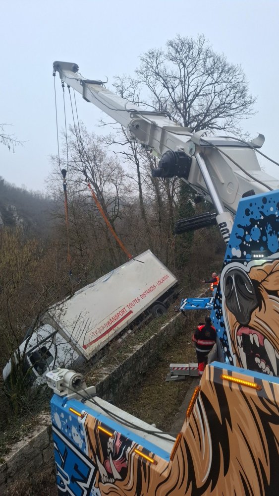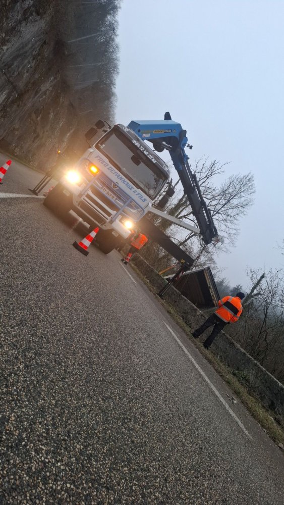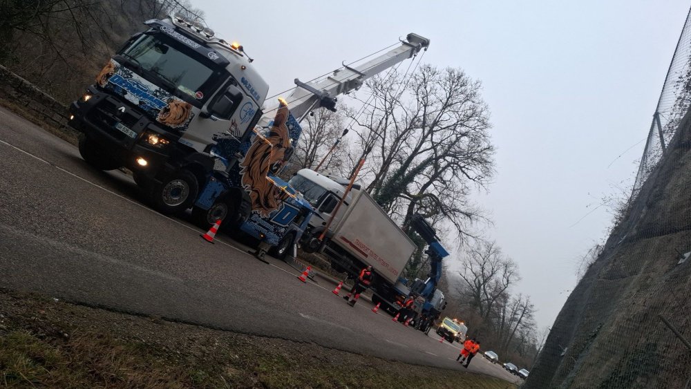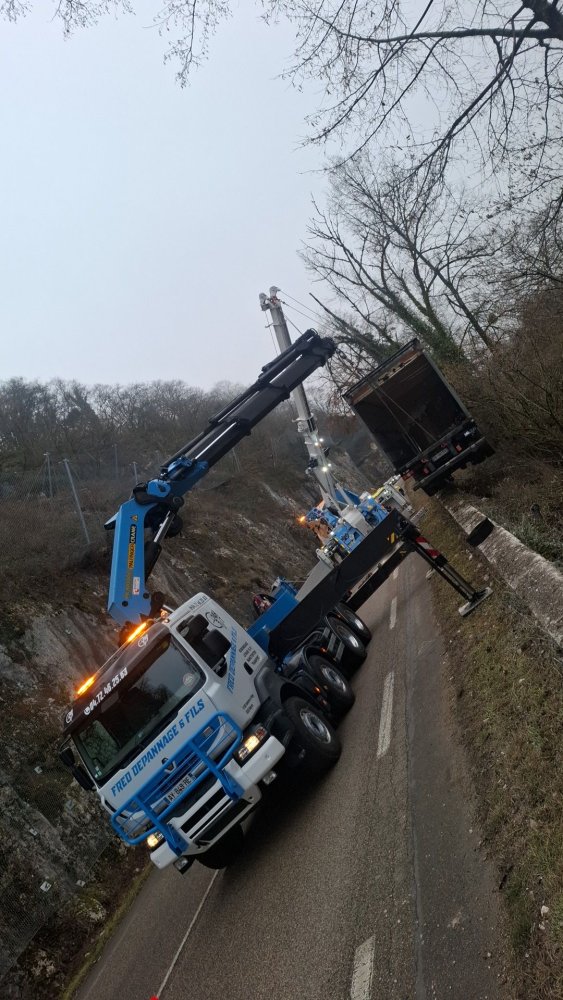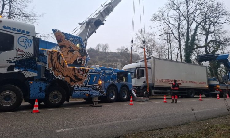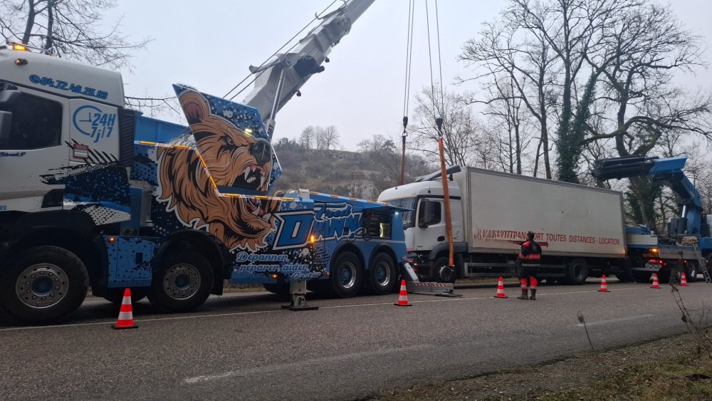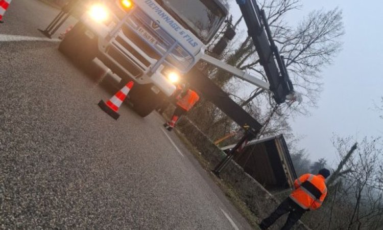 Un poids lourd s'est renversé le 19 janvier 2026 à Poncin, en Auvergne-Rhone-Alpes, nécessitant une opération de dépannage d'envergure avec l'intervention de moyens spécialisés par nos dépanneurs pour le relevage du véhicule et la sécurisation de l'axe, fortement perturbé pendant plusieur heures.